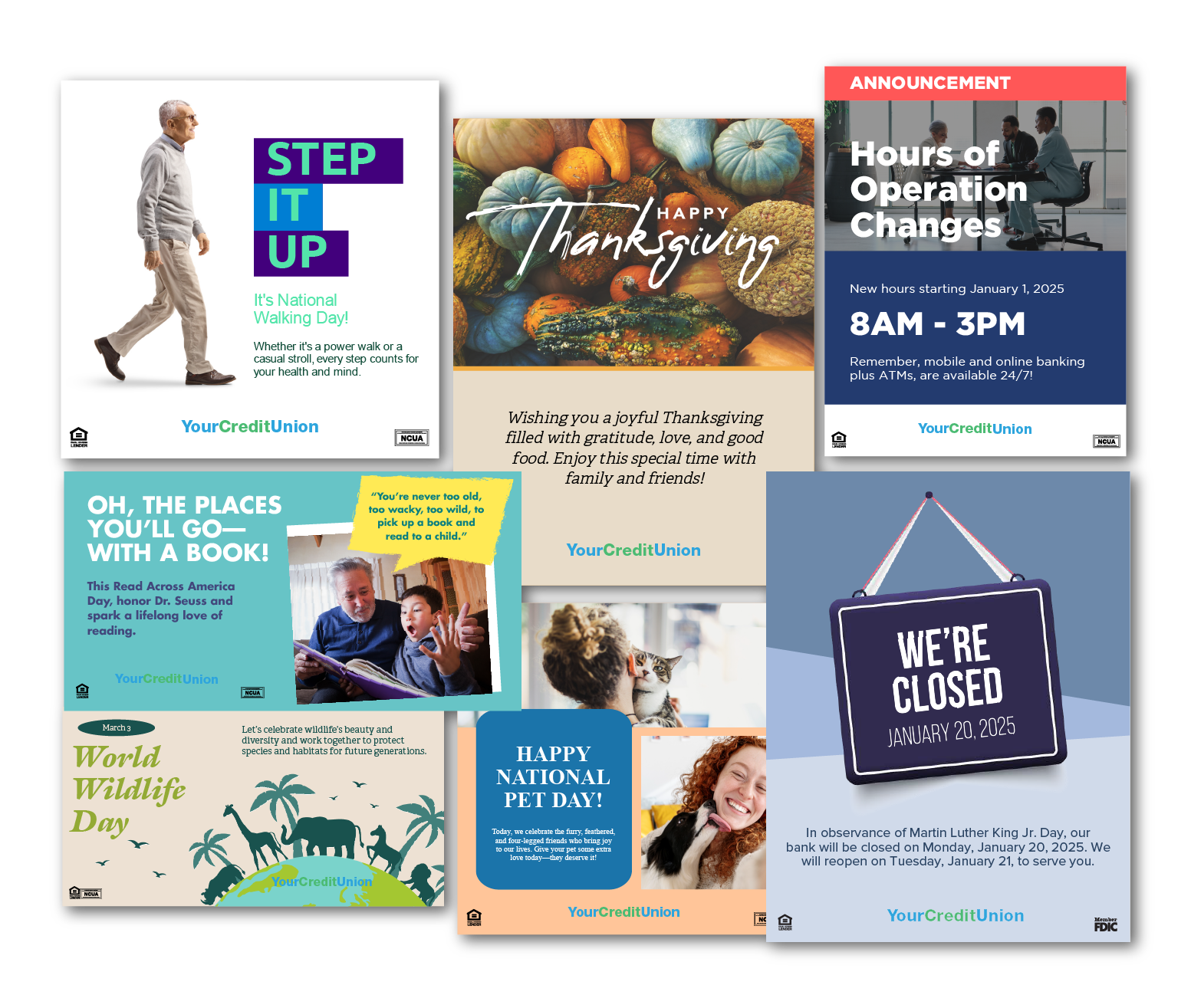 You know your holiday hours, but your members may not. The Credit Union Marketing Center portal equips credit union marketers with thousands of ready-made holiday observance templates for social media and in-branch digital displays. Our creative campaigns cover everything from celebrating special days to sharing important updates such as branch hours. With our professionally designed, customizable layouts, creating your message is quick and easy, with no design skills required.